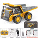 9-channel 2.4GHz dump truck with remote controls for lifting, lighting, sound effects, and directional movement.